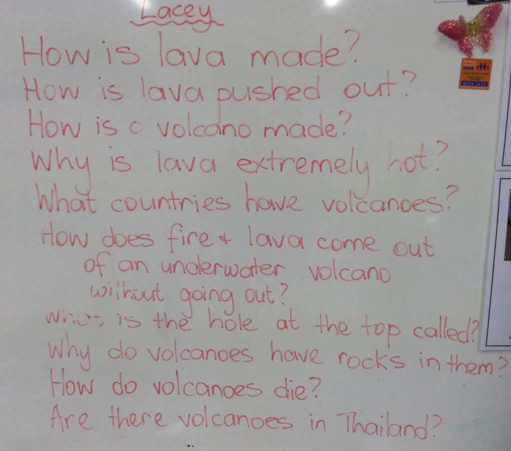Can you imagine their delight when it emerged from the cupboard and not only that, I opened it (not easy as the tabs fit so snuggly) and we then talked about the parts of a volcano. My students are full of questions about volcanoes and for the first time, I am not being the font of all knowledge. I am trialling the idea of putting our questions up onto twitter or putting the onus back on the students to help find the answers. With the first batch of questions, I have recorded them and we should be able to tick off a few now. Here are the questions from one of our reception classes: