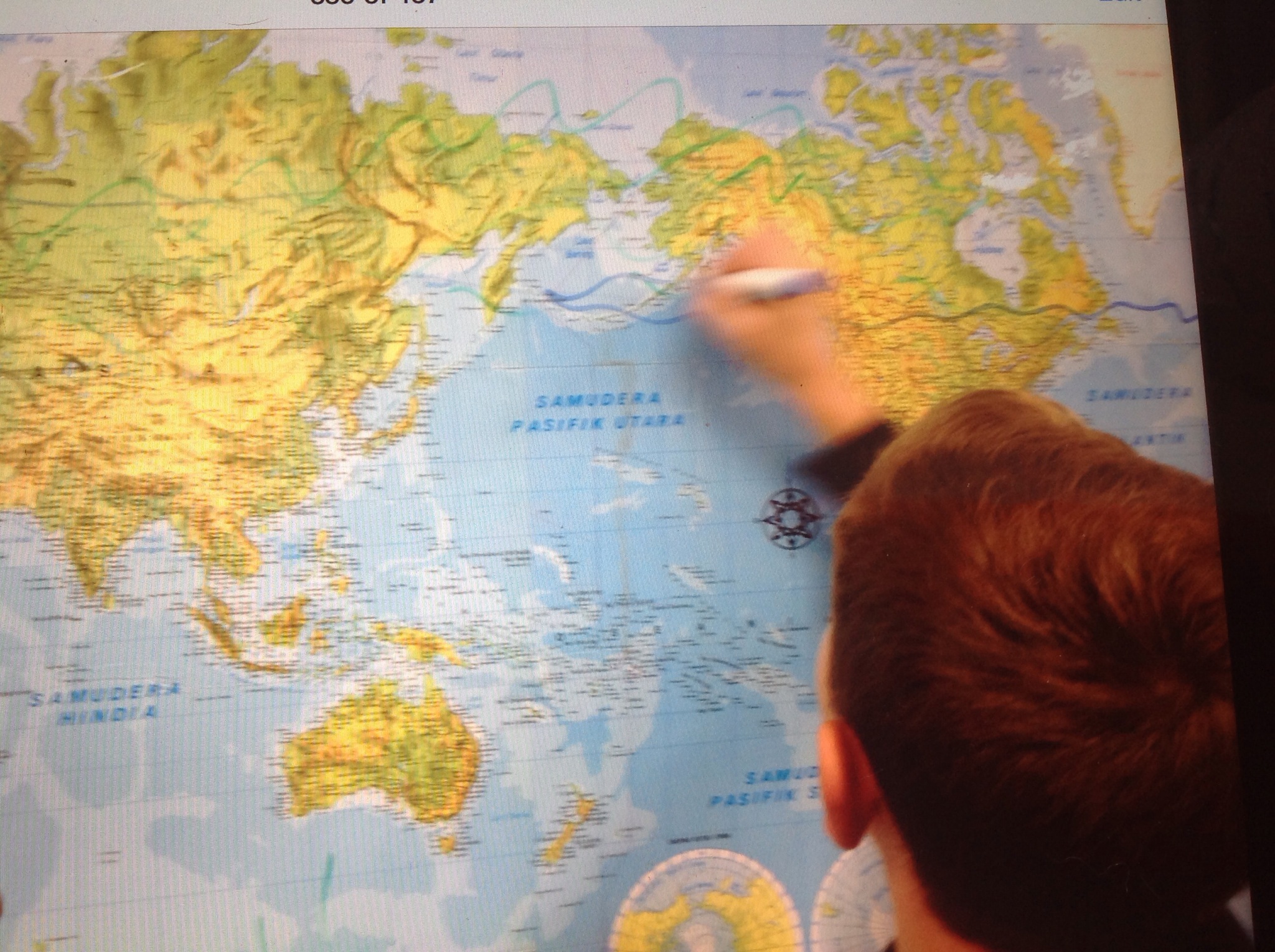 The mappers began with the map of the world on the back wall, progressing to the maps of South East Asia and eventually to the large map of Bali. I was again amazed that the maps seemed to be the ‘atlas’ of choice over the Google Earth. Our year 7 teacher/ICT coordinator, Kathy, joined us for the Mystery Skype and we discussed this interesting development. Maybe when we Skype a non-Indonesian country and I don’t have detailed maps for them to use, Google Earth might be more popular. It was great having another adult in the room to discuss it all with and to soak up the atmosphere together. It really was electric and unless you have experienced a mystery Skype, it is so hard to explain or describe it without sounding like a total nerd.
