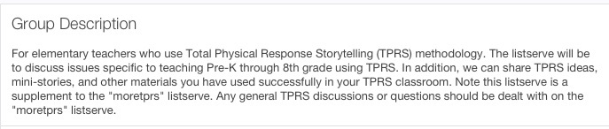 The former is full on and if I don’t check my emails regularly, I can be overwhelmed by up to 50 emails weekly. While most who post on this yahoo group are American high school Spanish teachers, often the big names of TPRS also check in and add their perspectives which is really cool. The elementarytprs group is very quiet by comparison which is a shame as I think I would connect more with other language teachers applying TPRS with younger students who have limited TL vocabulary.