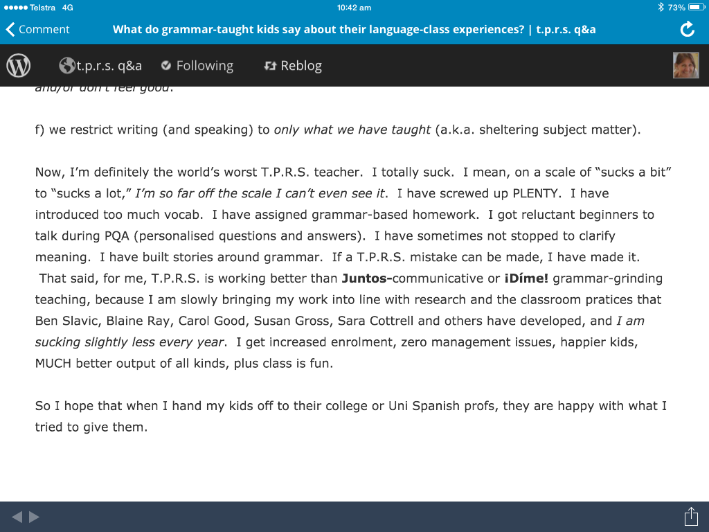 The topics currently being covered by the moretprs group are largely above my TPRS head, however they none the less help slowly but surely fill in the gaps of my TPRS knowledge. Up until very recently, acronyms such as ACTFL, FVR, TPRS/CI & PQA were foreign but are now meaningful, thanks to this group. Trending topics currently include the usefulness of language labs (most agree iPads/iPods are far more versatile), the value of teaching thematically (not recommended by TPRS guru’s) and the recommended rules to implement during storytelling. Another aspect of this group I really like is the balance of theory and practice and how each supports each other. Here is a great blog post which demonstrates this.