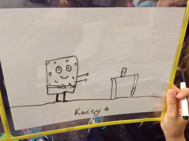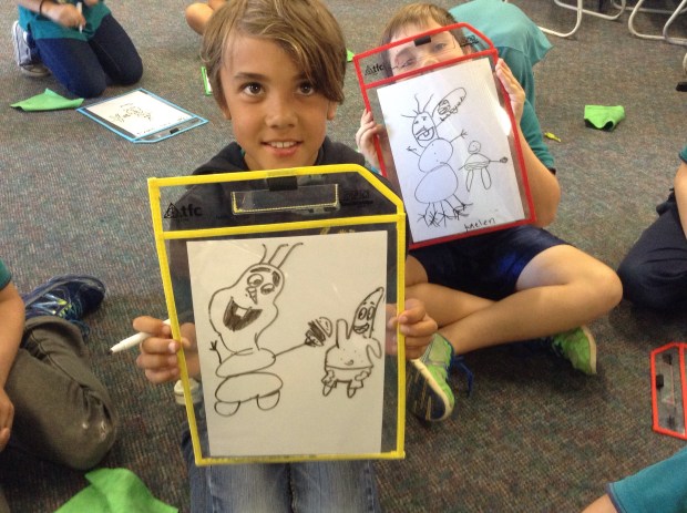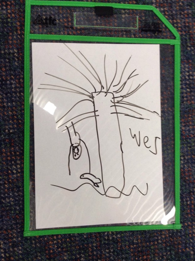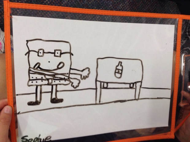 Here’s how I did it. I firstly showed students a notebook file containing clipart pictures of vocabulary such as bus (grammar pop up opportunity for Indonesian pronunciation) to not only help students turn their language switches back on but to also give them ideas on how to draw certain objects. I then said a sentence that included one of the target structures, a familiar character and cognates and asked students to illustrate it while repeating it several times. Perfect for getting in more repetitions! The students absolutely loved this activity and I can see how easy it would be to overuse this as it was just so enjoyable for everyone.