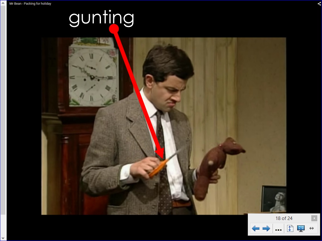 Most CI teachers rave about Movietalk. Movietalk is using a short video/film as an engaging method of sneaking in repetitions of specific target structures. Martina Bex has a very detailed explanation on her website. Catharina mentioned in our last Skype call that her students (junior primary) absolutely love movietalk and constantly ask for another one. It was a technique that I was both been very keen to try and yet was also apprehensive about trying it. While I knew students would enjoy watching and talking about a movie clip, I am aware that my students only have a very small pool (puddle) of acquired structures and also that I am still a real TPRS beginner!! Circling, PQA etc are TPRS techniques I am still developing and the idea of doing them all on the fly about a video was slightly intimidating. So, I read up about it, looked at video clips recommended by other teachers and put it in the ‘maybe later’ basket. Then on the moretprs listserve, this Mr Bean video was posted as a good Movietalk option. As soon as I saw it, I was struck with how perfectly it supported: