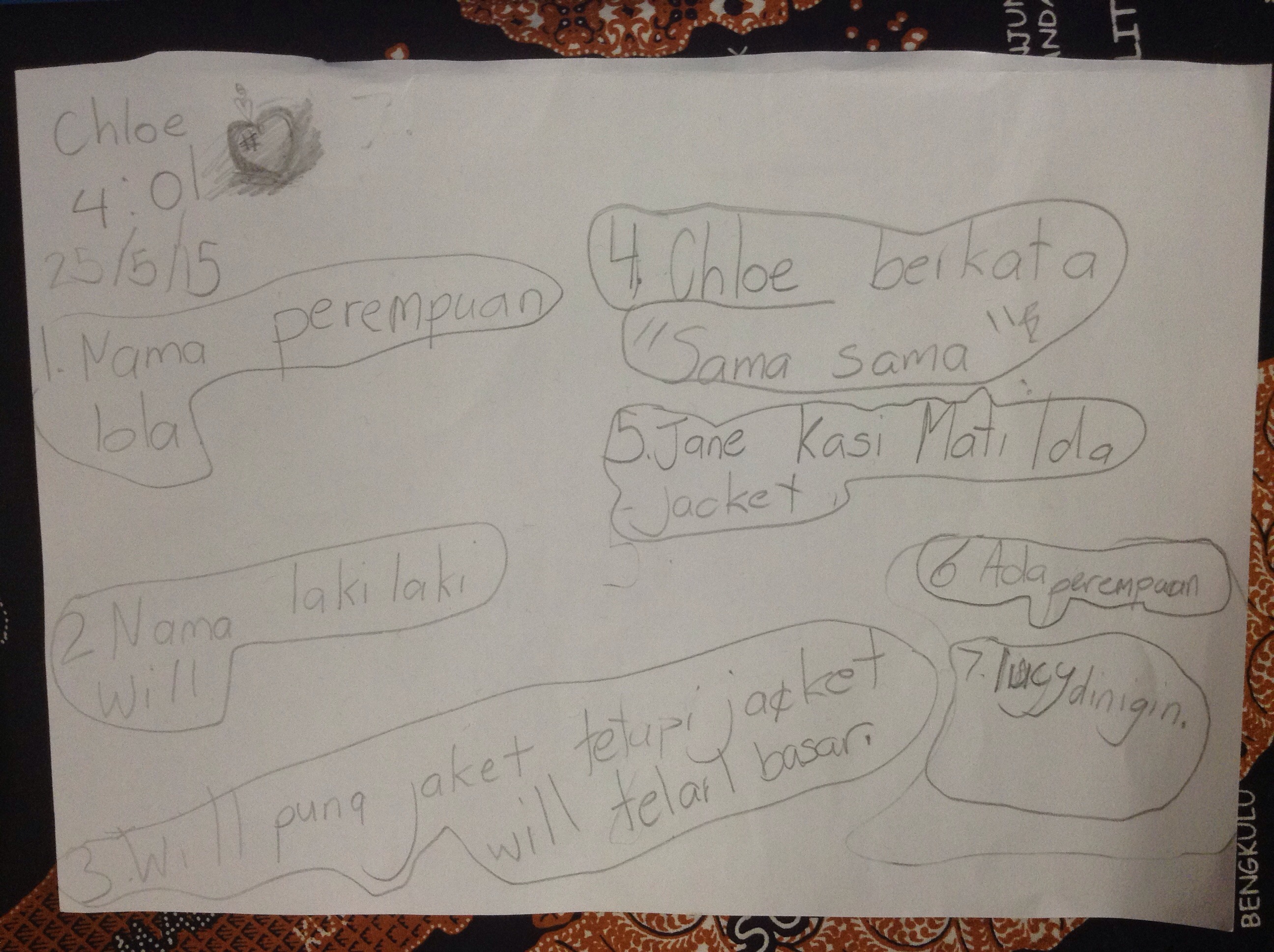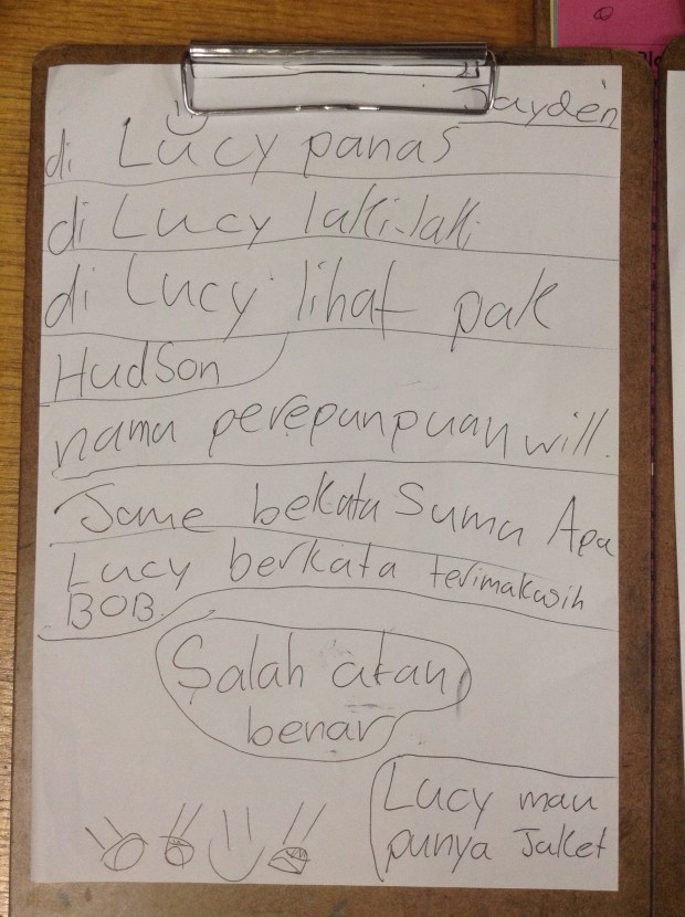 - Sekretaris – At the start of each lesson, I nominate the sekretaris by looking at the notes made on the class list by previous sekretaris’ to see who has not yet been sekretaris or who has not done as many jobs as everyone else. The job of the sekretaris is to write a student name against each of the jobs on the board (with a few exceptions), again choosing students who have yet to complete the same number of jobs as everyone else. (I used to do all this, but it was so time consuming and led to a lot of unnecessary blurting in English) Once this has been completed, the sekretaris sits in kelas satu (sekretaris has the most luxurious chair) and then completes the checklist by writing against the students name the jobs that they were allocated to do. The sekretaris is also responsible for collecting any student work (quizzes, freee writes ect) fromm the lesson and putting it neatly in the class folder.