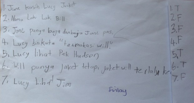 - Penulis Quiz – The quiz writers job is to choose 7 or 12 sentences from the story that the class is currently working on. The number is 7 if the quiz is out of 5 or 12 if the quiz is out of 10, with a couple of spares in case one or two of the sentences are not suitable. The quiz is a true/false quiz (benar/salah) and thus the sentences written by the penulis ujian can be either taken directly from the story (benar) or tweaked (salah).