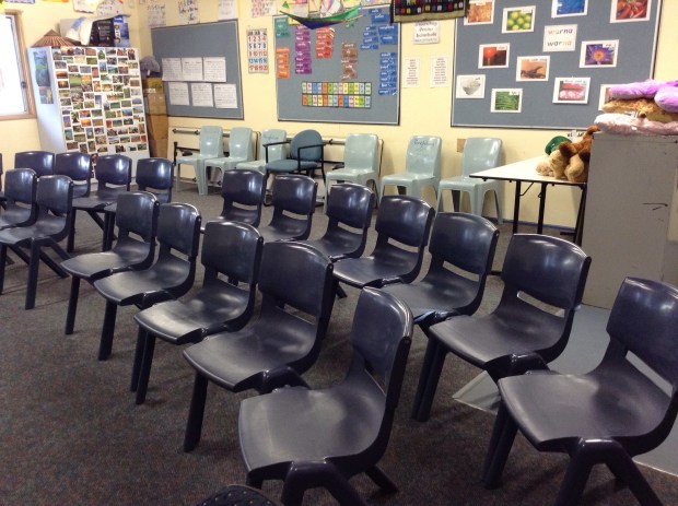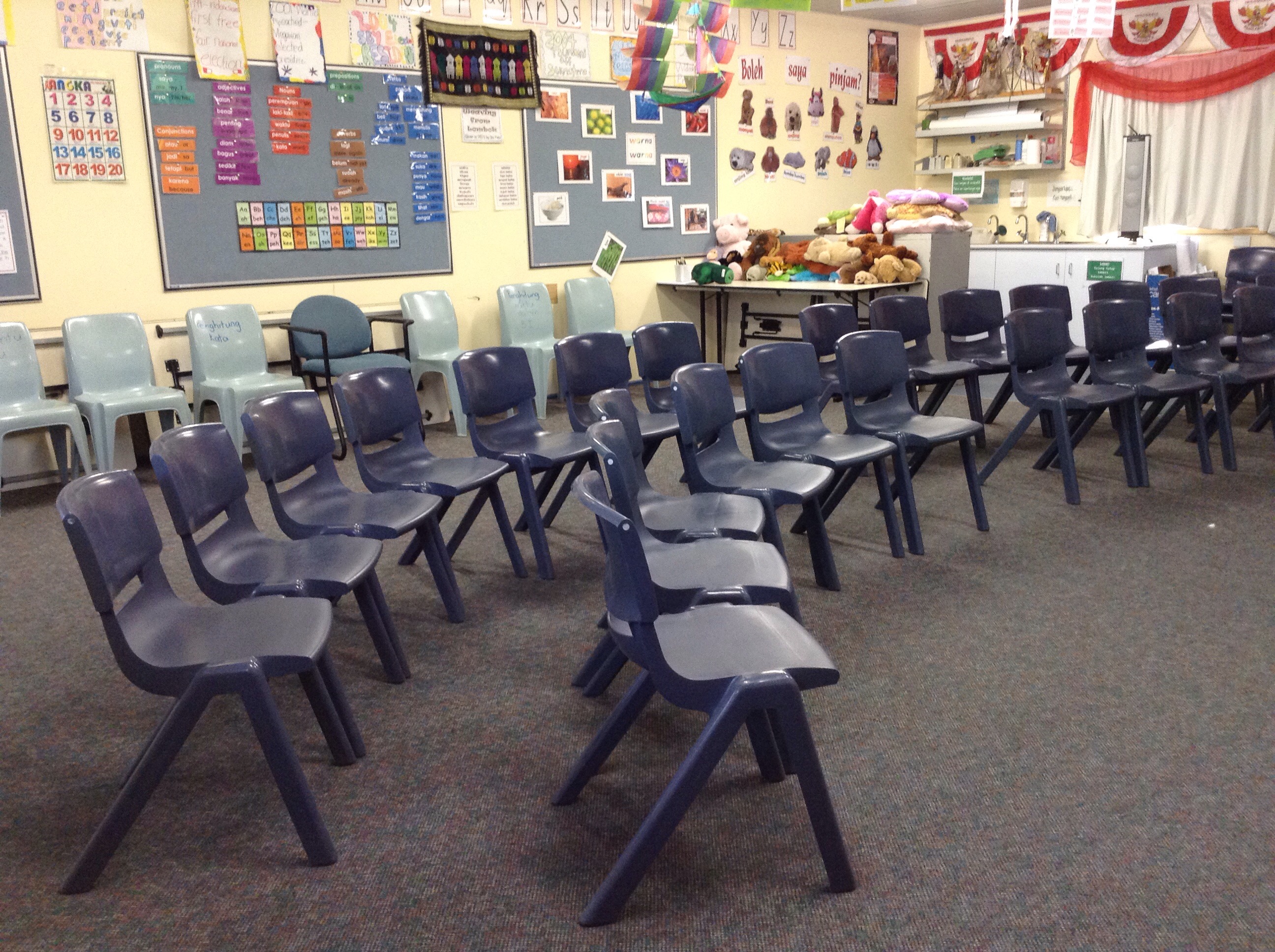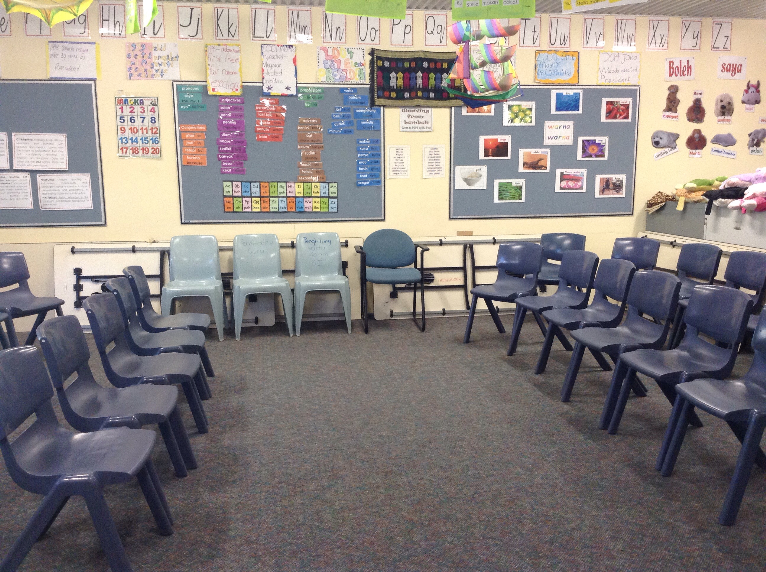I am very lucky because when we moved to our new site in 2007 each teacher was given the opportunity to choose the furniture they would like to have in their new classroom. I chose trestle tables (which came with a bonus trolley) and stools. I have always loved the flexibility of trestle tables as they fold flat when not being used and are so portable either in the classroom or when transported around the school. 6 students can sit at them comfortably and when pushed up with one end against the wall, it creates an illusion of an open & spacious room. I chose stools rather than chairs because they are more practical for the range of student sizes and ages (5 to 13 years) I teach each day. My very first classroom at the old site contained a mish mash of tables and chairs of all heights and varieties which in itself spoke volumes about the value of the Indonesian Language program! I was very relieved to be able to leave that cruddy furniture behind! Yet, the very first thing I did when I initially made the decision to attempt TPRS methodology, was to fold up my tables and stack them at the back of the room!! For that lesson I put the stools in a circle which in retrospect was valuable because as soon as students walked into my room, they knew something critical had shifted and it wasn’t just the tables and stools! Students loved too, the privilege of sitting on stools while listening to me; previously they’d sat on the floor and then moved to the tables to complete set tasks. However I soon found that the stools did not work. For all students, the stools weren’t particularly stable, so after a while, I stacked them too at the back of the room and expected students to sit on the floor once again, except for students doing jobs; they could sit on chairs at the back of the room in kelas satu (first class). My room stayed like this for a whole term and then during the last holiday break, I read about the value of brainbreaks to help students cope with sitting still for large blocks of time. I remembered too sitting in conferences for hours on end and being uncomfortable and imagined that sitting on the floor would be even more uncomfortable. I then also began to realise that it was difficult to dictate student seating when they are sitting freely on the floor. So during that holiday break, I carted all my stools up to the shed and swapped them for upper primary chairs. I firstly set out the chairs in 2 rows in a semi circle facing the white board (kelas dua) and a narrow aisle running up the middle, with kelas satu still along the back wall. The area in front of kelas dua has become ekonomi! I chose the word ekonomi because it is a cognate. Later I want to investigate the frequency of the word ‘lantai’ (floor) to determine the usefulness of it in the classroom.