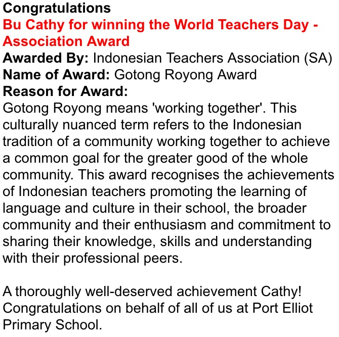 Thankyou INTAN for nominating me for the 2015 Gotong Royong Award. It was such an honor to receive this award and I am truly humbled to have been acknowledged by such a wonderful organisation. Receiving the award has helped me realise just how lucky I am to have a job which incorporates my two passions – TPRS and Indonesian. Terima kasih sebesar besarnya teman teman di INTAN.