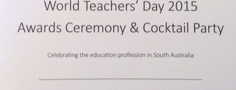 Last Friday night, the SA World Teachers Day Awards Ceremony & Cocktail Party was held at EDC in Hindmarsh. During the ceremony, it was explained that while World Teachers Day is celebrated internationally on October 5th, in SA (and other Australian states), it is celebrated on October 30th so that it falls midterm rather than during the school holidays. World Teachers Day was established in 1994 by UNESCO to “acknowledge the important contribution made to our community (by teachers) in an increasingly complex, multicultural and technological world.” Source: education.nt.gov.au