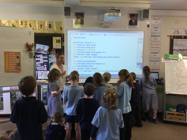 Sharon began her day with a year 5/6 class. She called the roll by asking the students random Indonesian questions: Siapa nama, apa kabar, Selamat siang, etc to which they students had to reply/respond appropriately. Certainly kept them on their toes and it was inspiring to listen to the majority respond so smoothly.