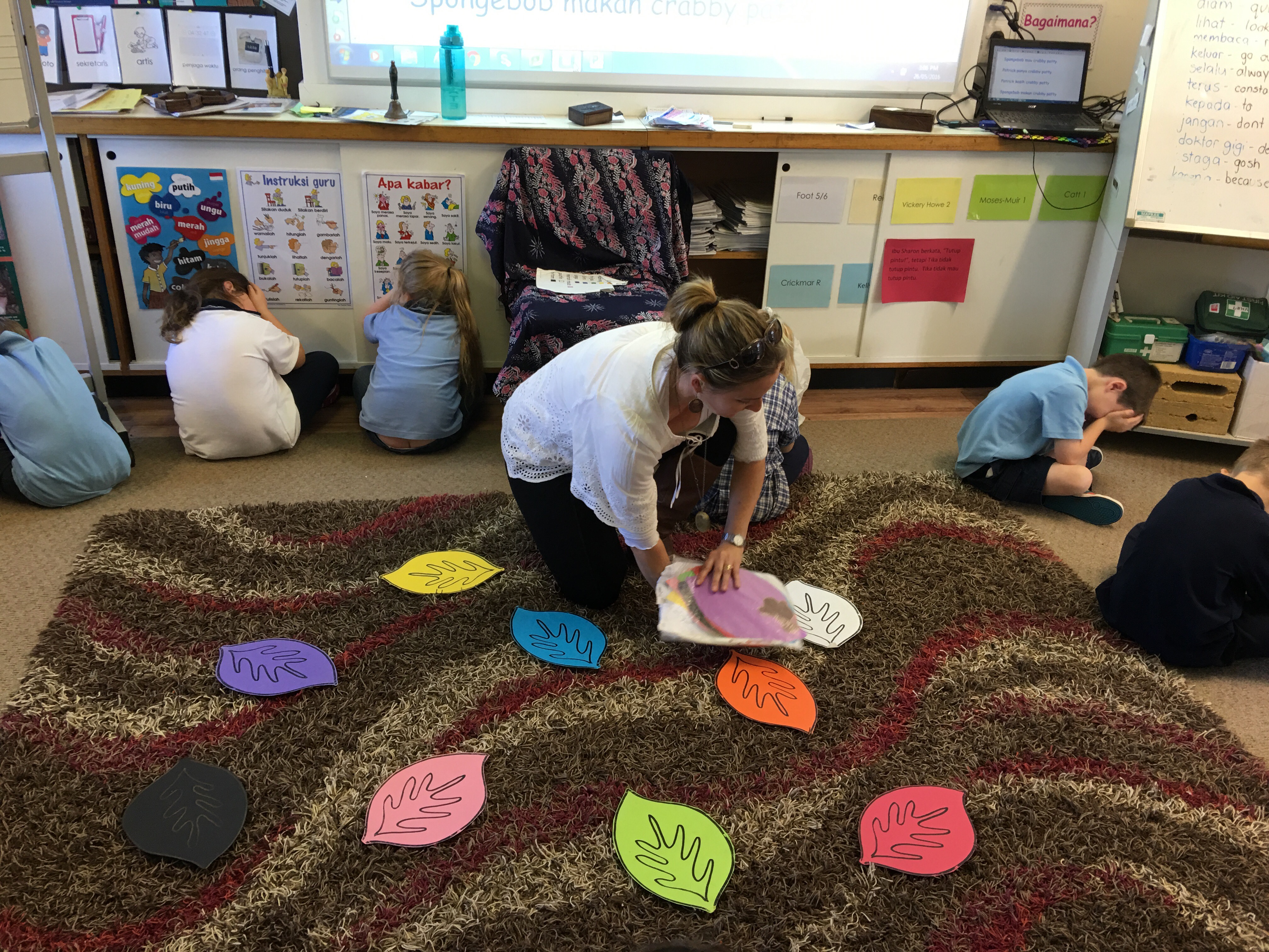 With this class, Sharon trialled the Spelling Battleships pre story activity. The stuents had to choose 5 words from the list and hide them in their grid and then to find the words they had to say the coordinates in Indonesian. We all then circulated to observe and assist. We all discovered that most students were so engaged in the game, they weren’t using Indonesian and their was almost no repetition of the target vocabulary.