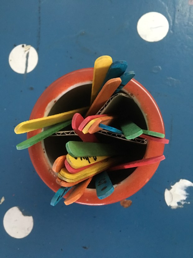 I use Ibu Cathy’s system just as she discussed and it is one of my favourite ‘activities’. The students adore it! I have 22 classes, so it is impractical to use names. I number the sticks, and also have them all in the same colour (too many smarty pants were saying, oh, it’s not me after they had had their turn). All my class lists are numbered. So we just look at the number, then I look at the class list to see who it is. Works fine!