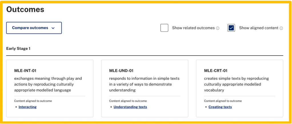In defining the Early Years substrand outcomes the NSW syllabus is the best in my opinion. Have a look at the following screenshot taken of the NSW Early Years Languages Curriculum Outcomes. Click on the image to go to the page & open the blue links which will outline just how beautifully CI/ADI and TfW align with ACARA outcomes.
