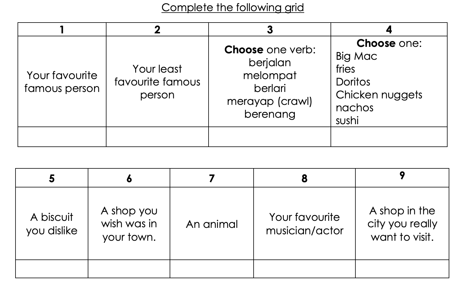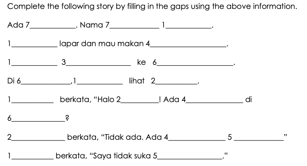 I have tried to keep the language as simple as possible because my TRT usually know no Indonesian so students will be relying on their own acquisition and the word wall. My lessons are 50 mins long, so after filling in the missing words, I have asked the students to create a comic strip using only Indonesian with the reminder that names of people, places and brand names do not change in Indonesian. I added this to remind students that characters speaking in ‘Indonesian’ comics will speak in Indonesian!!
