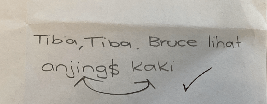 The tukang kertas (paper distributor) and the tukang pensil (pencil distributor) were asked to distribute lead pencils and blank sheets of blank A4 paper. Students were next instructed to lipat (fold) the paper tiga kali (three times) and I demonstrated several times as I repeated ‘lipat’. I gave my folded demo sheets to the tukang kertas & tukang pensil or anyone who walked in late.