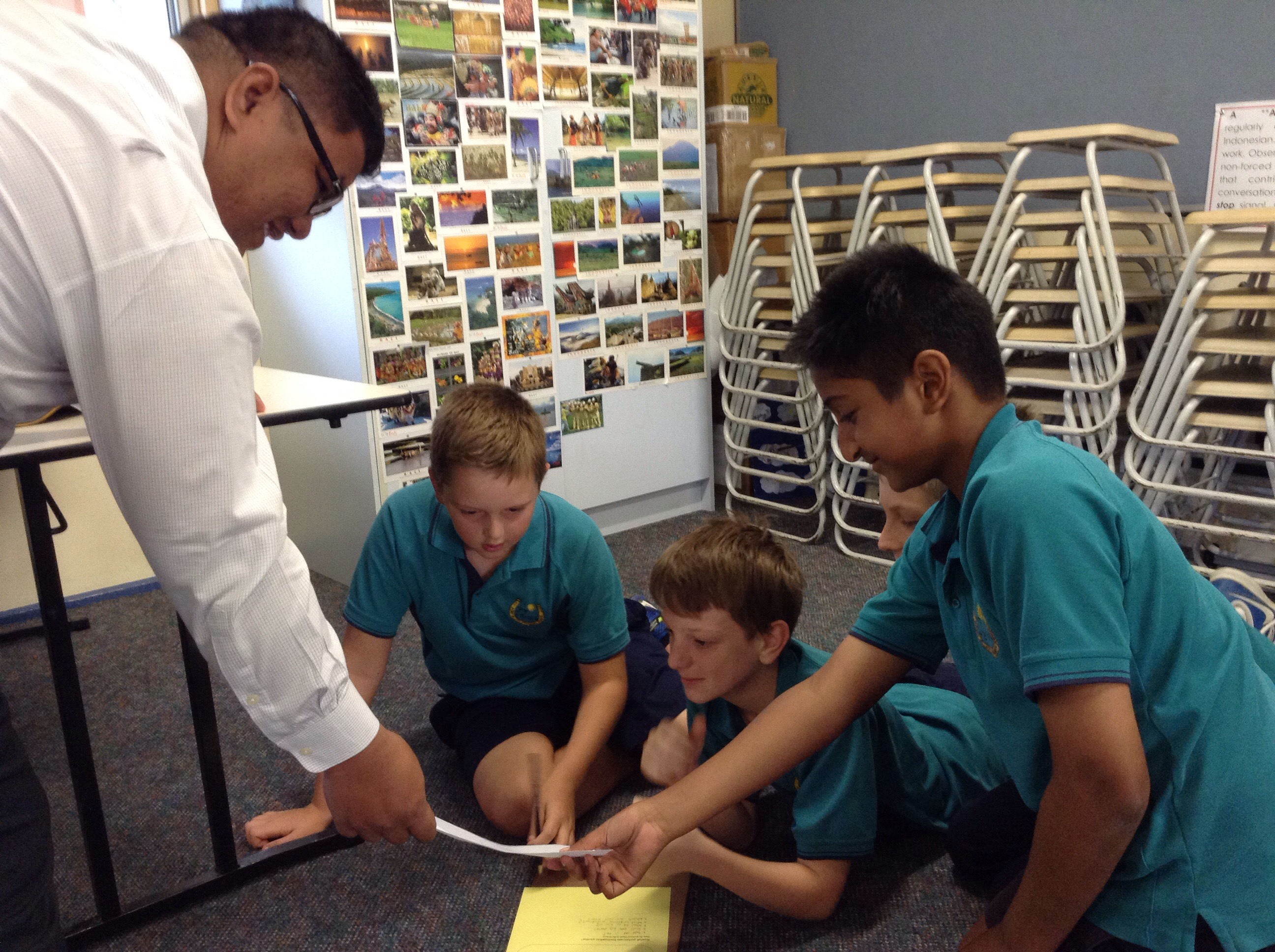 After recess, in my non contact time, Sandy, the year 3 teacher, Skyped us for a mystery Skype. The original plan had been to do the mystery Skype from Sydney but for many reasons, this didn’t happen. Because the aim of a mystery Skype is to guess the location of the other ‘school’, we couldn’t tell anyone at all where Pak Pahot and Ibu Eliza come from beforehand!! We sat in the Indonesian room while the Year 3’s remained in their room, each with maps of Indonesia in their laps. There first question was, “Do you live in the Northern Hemisphere?” which was a great one as it eliminated so much of Indonesia and didn’t take them long to hone in on Medan! It was lots of fun even though the poor students were confused when I asked them to look at us and in doing so turned their back on us as the webcam was on the PC yet we were projected up onto the smart board!! Sorry guys!!