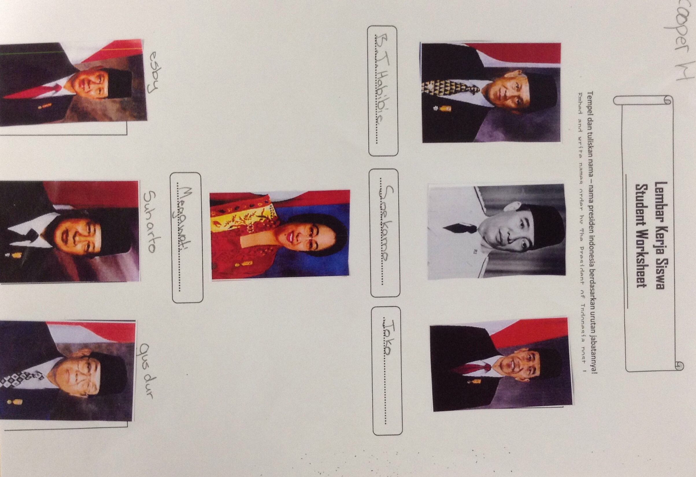Consequently Tuesday was a lovely day for us all. I supported both teachers for 4 of the 5 lessons I usually teach on Tuesdays with translations and classroom management while students thoroughly enjoyed being taught bilingually. Ibu Eliza’s lesson had several components to it and in retrospect would have been less rushed if we had spread it over 2 lessons, yet because we had so much to get through in 50 minutes, they didn’t have any time to get distracted. Students were divided into 7 groups and then given a page with a small picture of one of Indonesia’s past or present presidents at the top. Under the picture, students had to write down 5 questions they would like to know about that president. The questions written by students were varied and ranged from what is his/her name? to: Was he/she a popular president? Each group then had to choose one of their questions and then they were given a paragraph of information about the president they were focusing on. Students had to read through the information to find the answer to their question. Any other information they discovered was written underneath a picture on another sheet handed out to groups. Had we enough time, Ibu Eliza had hoped that each group could share what they had learned about each president, however we were getting close to the end of the lesson, so we jumped straight into the next step which was to hand out another sheet with 7 boxes and 7 pictures of each of the 7 presidents and have students glue them on in order of presidency writing their names down underneath. By the 2nd lesson, Pak Pahot had simplified this for students by numbering each picture on the back! Students then had to ask each other for names of each president. The students responded well to this lesson and as the students needed to work quickly there was little time for off task behaviours. I did enjoy a quick discussion with one group who had Joko Widodo. They asked me to confirm if he was the current president who supported the death penalty. When I confirmed that it was, they then all had a really great discussion on their own opinions. I was so impressed with their comments and that they didn’t all agree yet respected each others opinions.