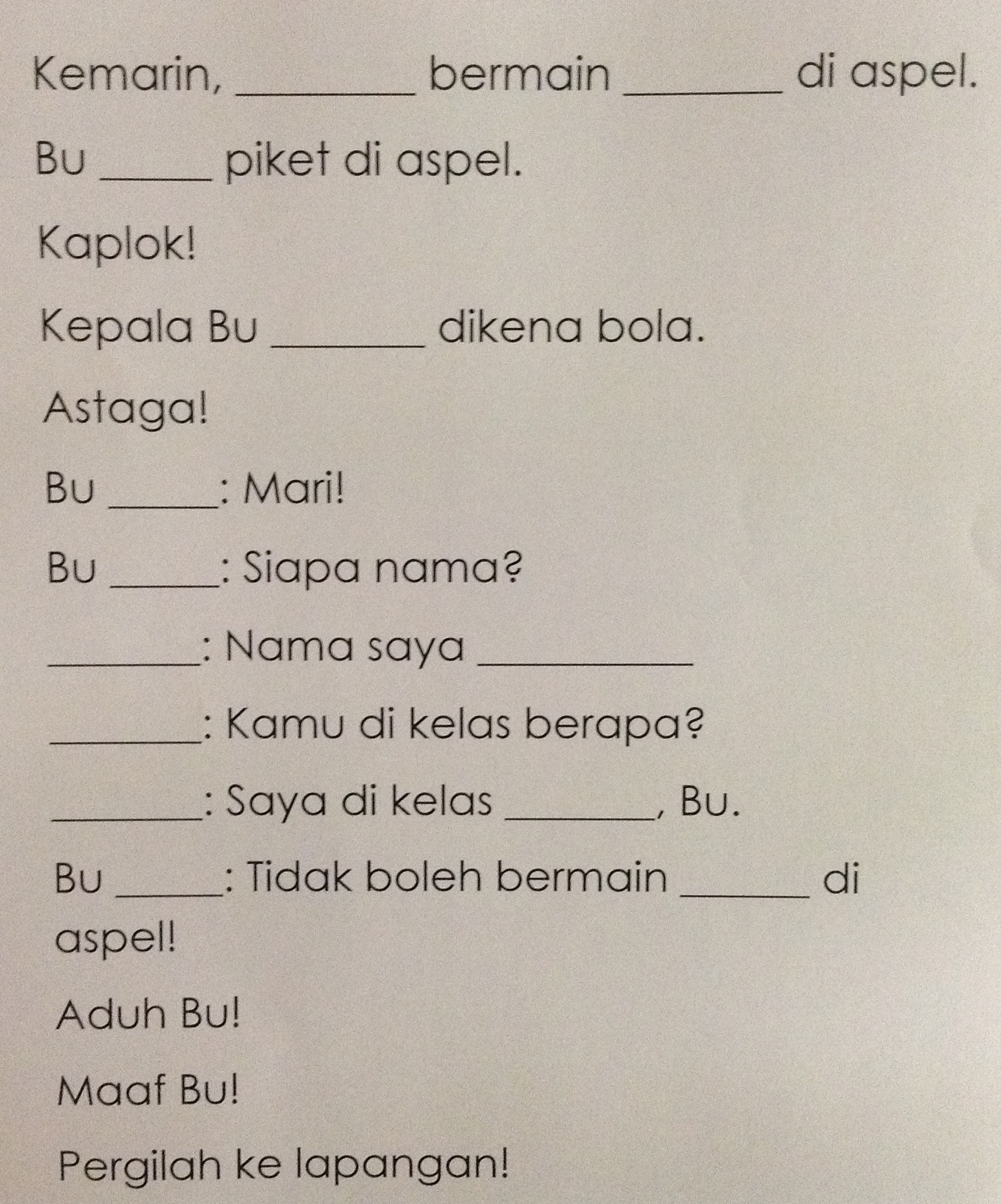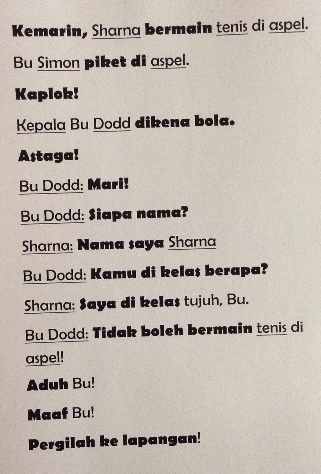 We then began the first lesson by focusing on the pronunciation of these new words. I next wrote the meaning for each word alongside it and asked the class to suggest a gesture for each. This was lots of fun and students were very creative. The gesture I particularly liked was for ‘piket’ (yard duty) which was the enactment of putting the duty vest on. Simple yet effective. Once the gestures were each firmed in our minds, I began circling with, “Saya bermain hoki.” Colby bermain kriket? Tayla bermain apa? Once students had relaxed with this familiar line of questioning, I invited a student to become my first actor, with, “Mari!” I then asked him, “Oscar bermain apa?” to which he replied, “Saya bermain futball.” As a class we then repeated this using gestures for each word. I then began the story and asked Oscar to mime each sentence. The first sentence included the word, “aspel” (asphalt) – vocabulary from 2nd term – and at that point in time I was surprised that not one student remembered this word which to my ears, even sounds like asphalt!! However later it became clear that as they knew it was against the rules to play football on the basketball court, they had automatically disregarded that option!! Funny really as this was the basis of my story!! (i.e. A student doing the wrong thing!)