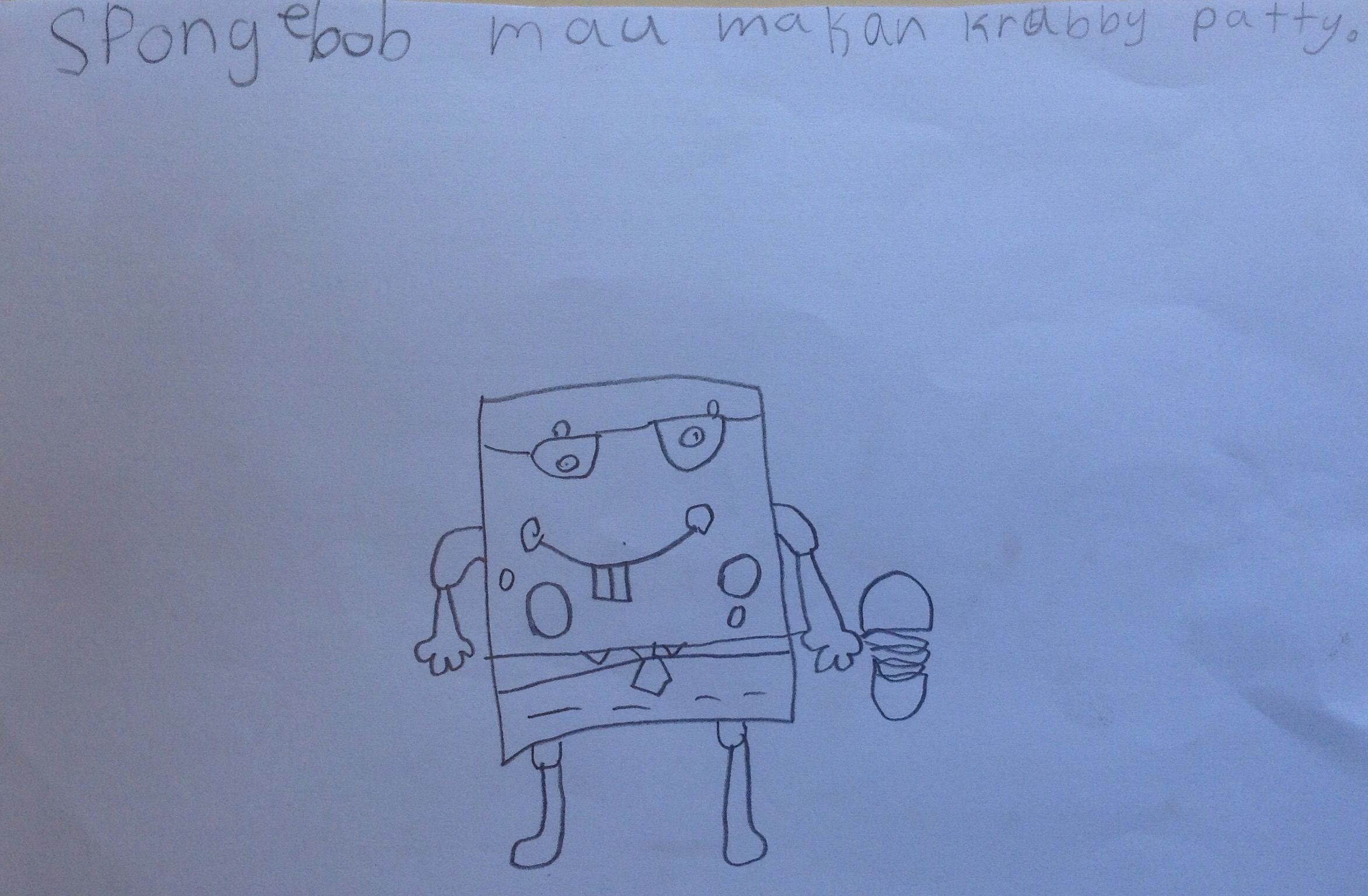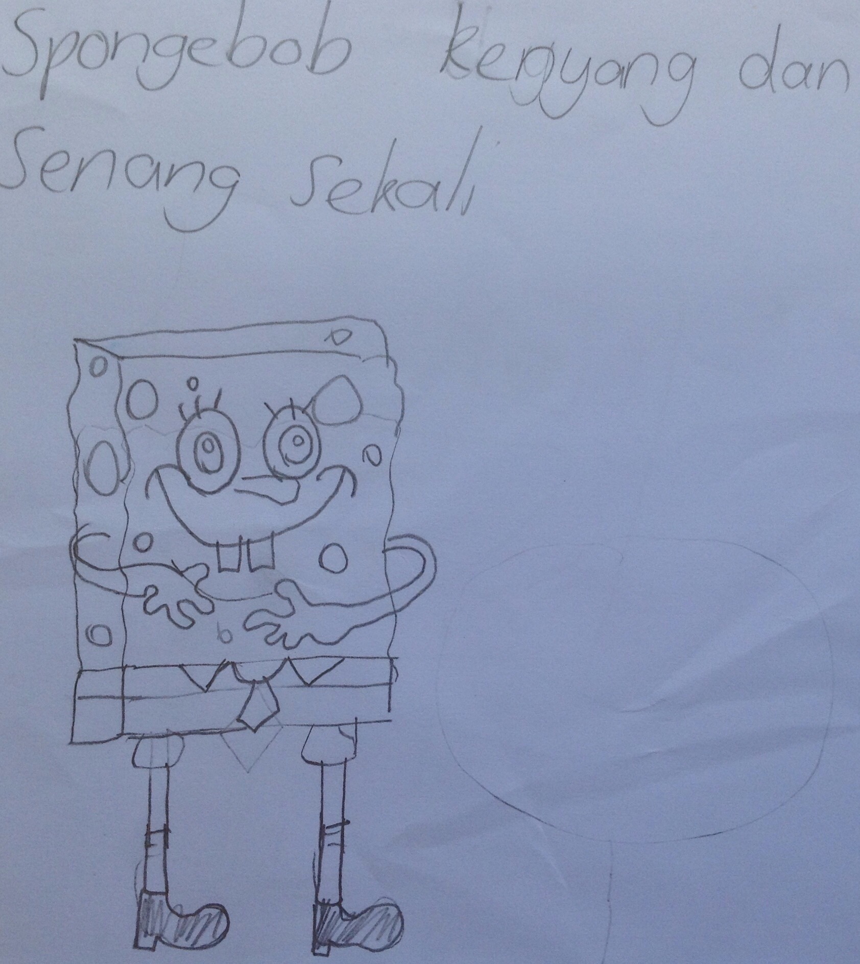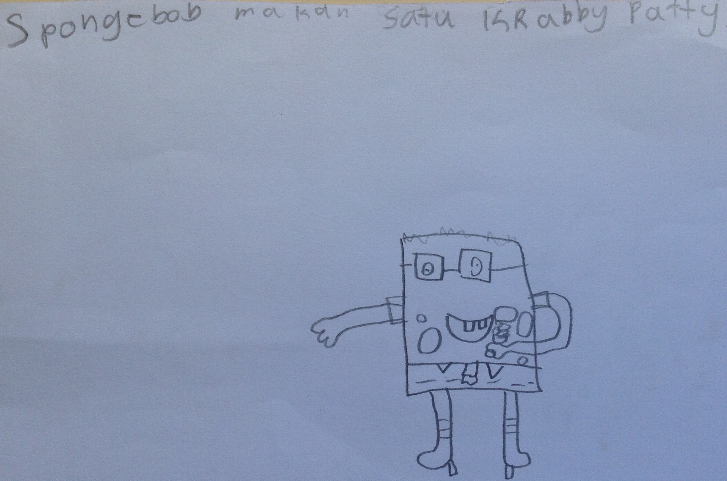 I decided to tackle the ingredients first with the thought that as soon as they were acquired, the method would be largely (although still not i+1) comprehensible. I began with a google search for images and found a large image of each ingredient. I then printed an A4 copy of each and laminated them. I didn’t label (ie write the Indonesian on) the pictures which at times was useful and other times frustrating. Probably should have though to assist with acquisition. I began by introducing this new vocabulary and encouraging students to come up with ways they could remember each. Both classes suggested remembering ‘minyak’ (oil) is easy because it is yuck (yak)!! Next students got into 6 groups (the number of trestle tables in my room). Each group was given 11 sheets of A5 paper & 11 laminated cards, each with one of the ingredient words on it. As a team, each ingredient had to illustrated, one per piece of paper. Here are just a few of them: