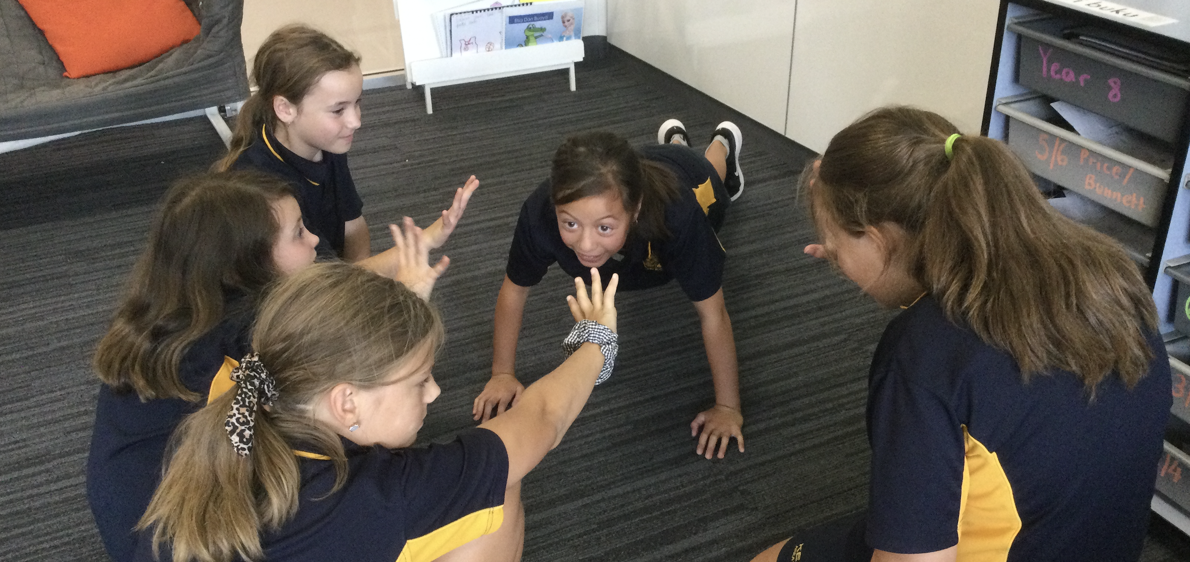 Team TPR is similar to three levels but instead the students are in small teams of 3-4. I haven’t tried this with 4 or 5 year old’s, however it worked well with 6-7 year old’s. Firstly, identify three structures from the story, then create a totally different and quirky frozen tableau for each to represent meaning. Using the structures kafe, buaya and berlari from the Elsa dan Buaya story, ‘kafe’ (cafe) could have one student kneeling on hands and knees to represent a table with the rest of their team ‘sitting’ around the table drinking tea (a flat hand to represent the saucer and the other hand up to the mouth with the pinkie outstretched), ‘Buaya’ could be represented by the entire team lying down side by side with arms open for crocodile mouths, and ‘berlari’ could have all but one student running and looking backwards with looks of amazement while the final student is crouching in the start position for a running race. Quirky poses increase engagement.An important difference between this game and the one above is that I am looking for the first entire team frozen in the pose with all aspects of the pose incorporated. If students wish to compete, points can be wawarded to teams that achieve this. Here is a photo from last year of a group of year 4’s participating in this: